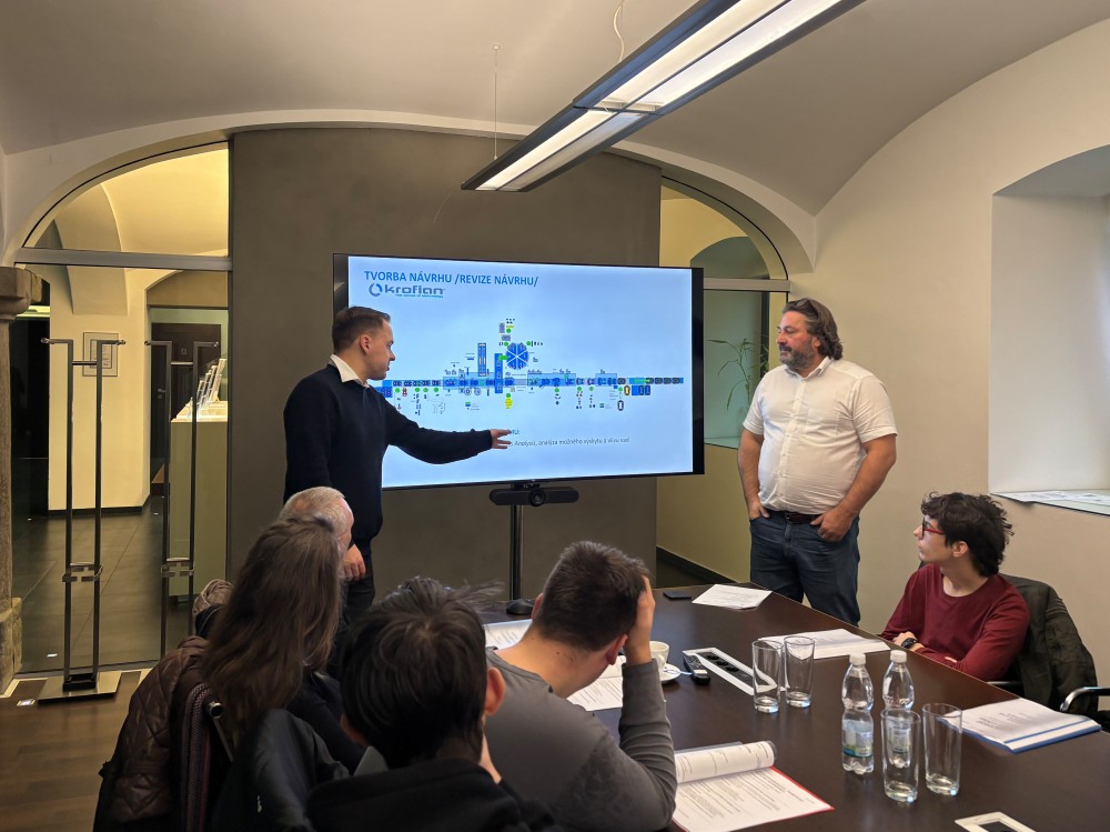 The day began with a session led by designer Jan Martínek and development and design manager Stanislav Koutný. Students delved into the backstage of designing and developing production lines – from the first sketches to simulations of work movements. The presentation was based on real projects, so it was theory with a clear purpose: to show how an idea turns into a functioning machine.