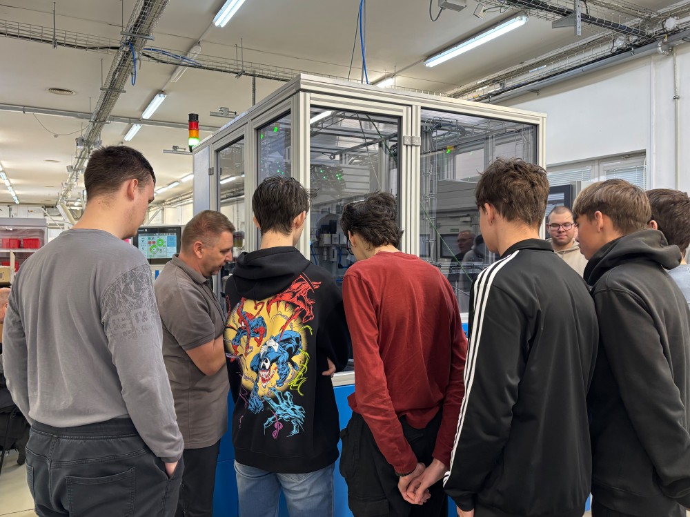 After a short break, students moved directly into practice. Assembly leader Jaroslav Cerha guided them through the lines currently being assembled. Theory instantly transformed into reality – metal structures, moving parts, and real processes they could experience hands-on.